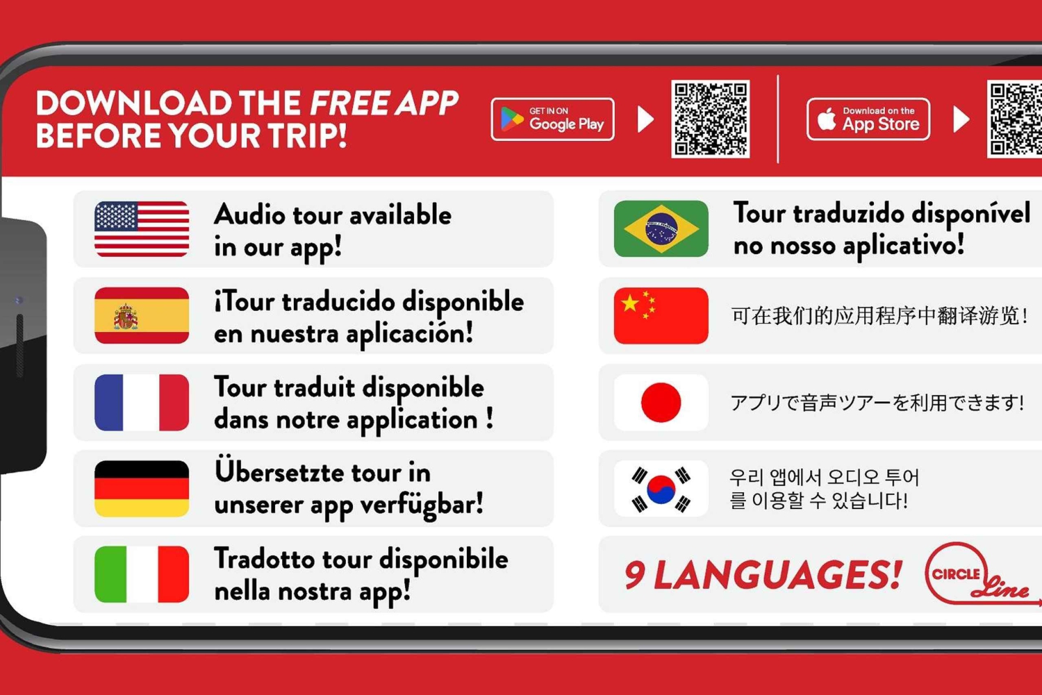 - - L'invité peut éviter la file d'attente au guichet. - Les prix sont susceptibles d'augmenter à l'approche de la date du voyage - réservez tôt pour obtenir le meilleur tarif. - Veuillez arriver au moins 45 minutes avant l'heure de départ pour l'embarquement. - Aucune nourriture ou boisson extérieure n'est autorisée. - Les personnes ne parlant pas anglais peuvent désormais télécharger l'application gratuite Circle Line Sightseeing sur leur appareil mobile à partir de l'Apple Store ou du Google Play Store. Cette application permet aux clients d'écouter une visite guidée pendant qu'ils sont à bord du bateau. Les langues actuellement disponibles sont : anglais, espagnol, français, allemand, italien, portugais, chinois mandarin, japonais et coréen. Veuillez apporter vos propres écouteurs pour écouter la visite. Les casques ne sont pas fournis.