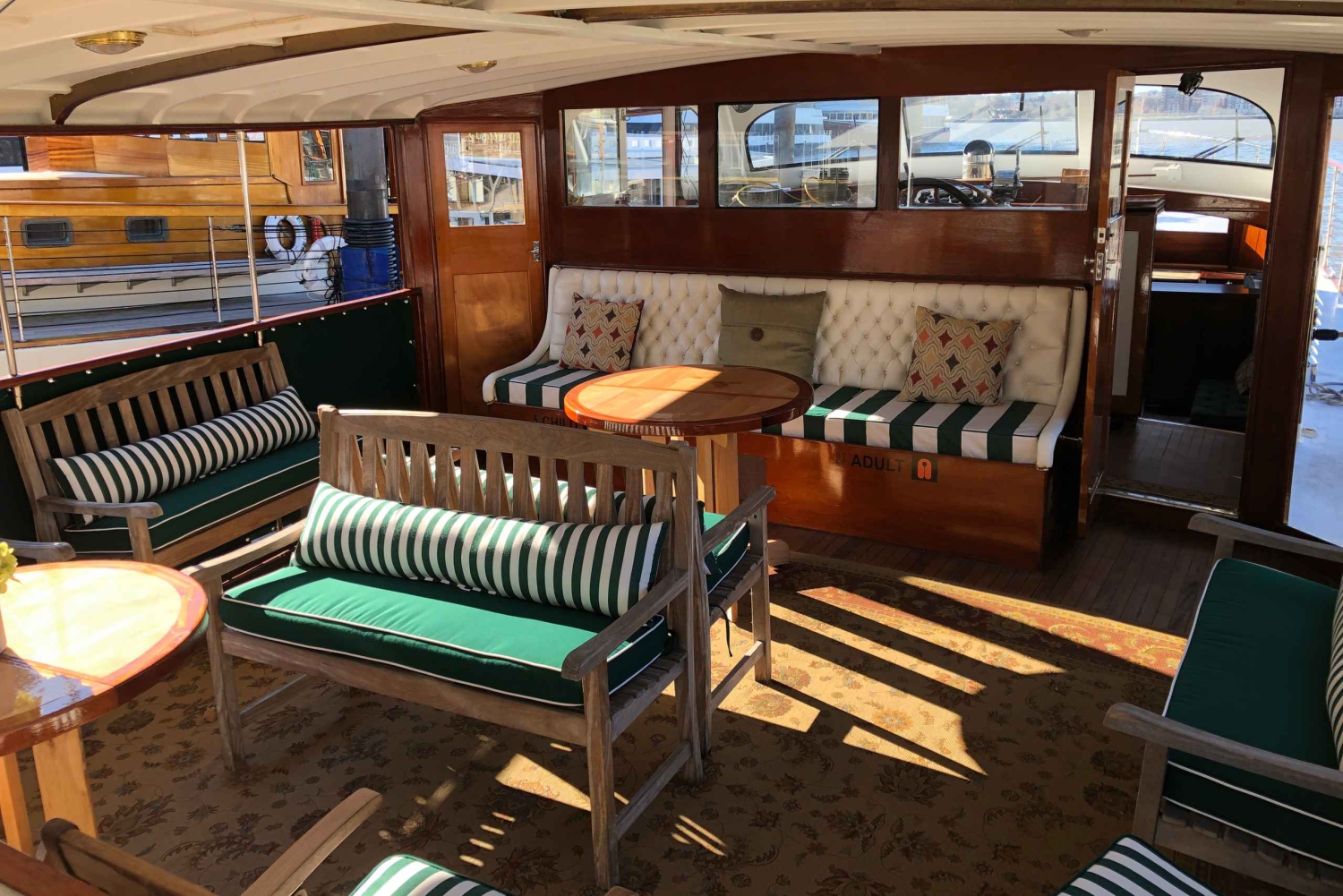 ハドソン川とアッパー・ニューヨーク湾のハーバー・クルーズで、美しいニューヨークのスカイラインとロウワーマンハッタンのライトアップされた摩天楼を体験してください。 チーク材とマホガニー材で装飾されたエレガントで快適な空間から、マンハッタンのスカイラインのゴージャスな眺めをお楽しみください。ヨット・フルムーンは、屋根付きのアウターデッキとオープンな船首が特徴です。各ツアーでは、自由の女神像やエリス島、ガバナーズ島やその周辺の風景をゆっくりとご覧いただけます。Includes