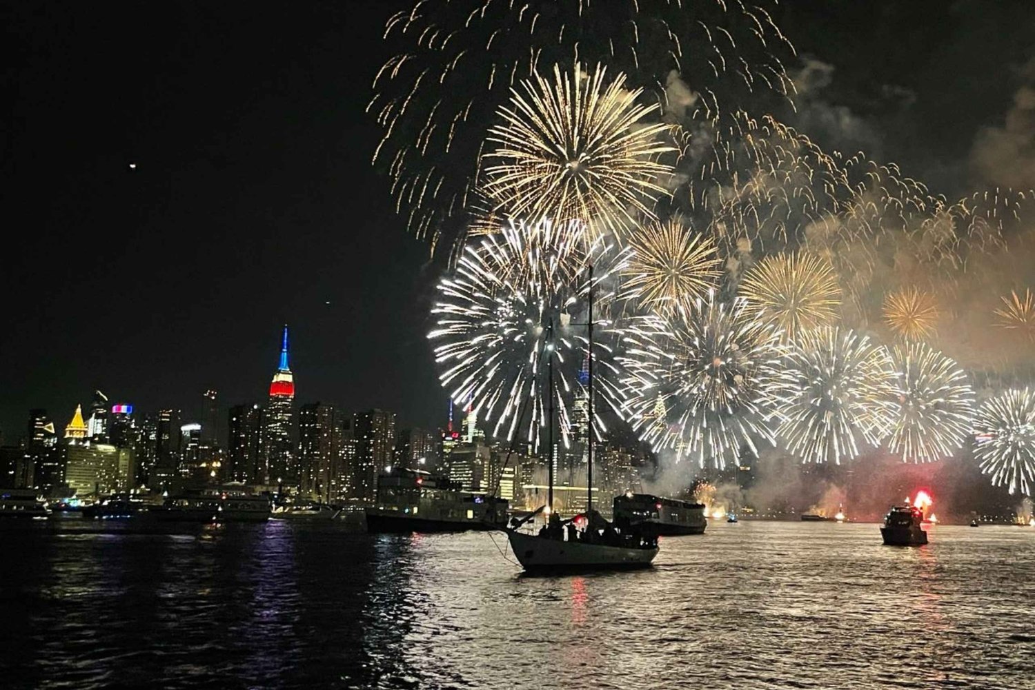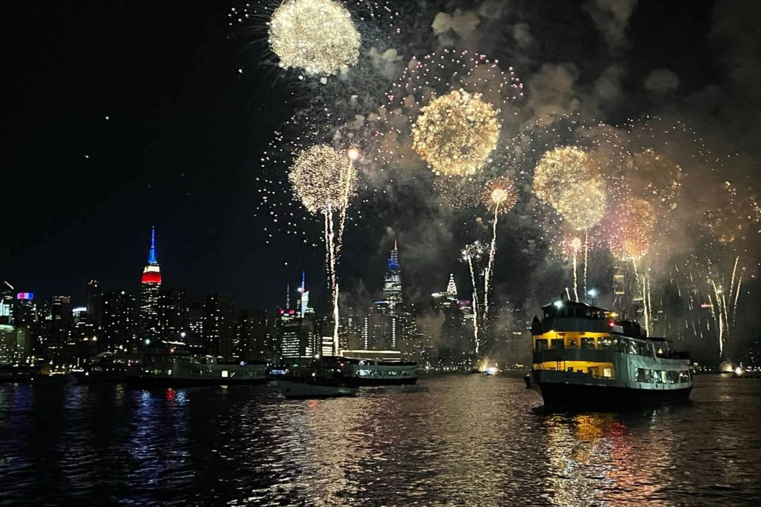 Feire uavhengighetsdagen i uforglemmelig stil om bord på Clipper City, USAs største passasjerskip. Denne eksklusive 4,5-timers opplevelsen kombinerer gourmetforretter, åpen bar, temacocktails og levende musikk. Seil gjennom New Yorks havn mens det blir skumring, og finn deg deretter til rette på den ultimate første raden til Macy's 4th of July Fireworks Spectacular. Se med ærefrykt på mer enn 40 000 raketter som lyser opp nattehimmelen og eksploderer over skyline i et blendende skue du aldri kommer til å glemme. Hev et glass, nyt hver bit og la havnens prakt og fyrverkeriets glans skape minner for livet. Dette er New Yorks mest ikoniske feiring av 4. juli – på et høyere nivå. Pakken inkluderer: En standard åpen bar, spesialcocktails med tema, gourmetforretter, middagscruise med utsikt fra første rad til fyrverkeriet mens du lytter til levende musikk! Det er en unik opplevelse: Du får glede av et sightseeingcruise rundt Frihetsgudinnen og et fyrverkeri-show i havnen på Manhattan!Includes