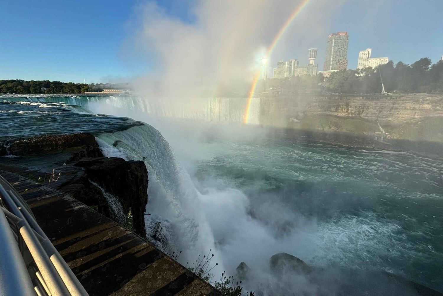 Отправьтесь в однодневное путешествие из Нью-Йорка к Ниагарскому водопаду. Путешествуйте по северной части штата Нью-Йорк, проезжая живописный регион Фингер-Лейкс, известный своими холмами, спокойными озерами и очаровательными сельскими пейзажами. По прибытии начните свое приключение с вкусного завтрака с видом на водопад, где вы насладитесь захватывающими видами на мощный Американский водопад, когда поднимается туман и рев воды заполняет воздух. После завтрака вы сможете прогуляться по живописным тропам парка штата Ниагара-Фолс, которые приведут вас к самым известным смотровым площадкам. Откройте для себя Козий остров, идеально расположенный между Американским водопадом и водопадом Подкова, и насладитесь панорамными видами, демонстрирующими масштаб и красоту водопадов. Затем вы отправитесь к водопаду Фата, где сможете ощутить освежающие брызги и сделать незабываемые фотографии. Для тех, кто ищет еще больше острых ощущений, предлагаются дополнительные мероприятия, такие как легендарная водная прогулка на лодке Maid of the Mist или посещение Пещеры ветров, которые позволят вам приблизиться к грохочущим каскадам для по-настоящему захватывающей встречи. После экскурсии вас ждет неспешный обед и свободное время, чтобы отдохнуть, приобрести сувениры или сделать дополнительные фотографии окружающего пейзажа. Во второй половине дня начните обратный путь в Нью-Йорк, любуясь меняющимися красками неба и прекрасными видами на закат.Includes
